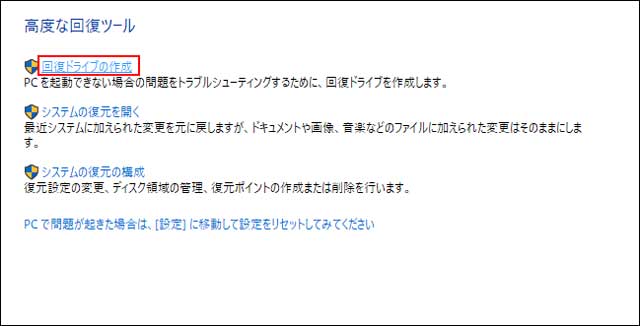 問題がないようであれば「回復ドライブの作成」を行うようにしましょう。