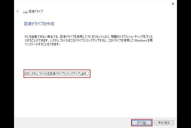 回復ドライブの作成画面内に表示されている、 「システムファイルを回復ドライブにバックアップします」にチェックが入っていることを確認してから、 「次へ」をクリック。