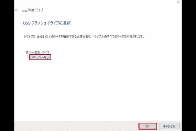 USBメモリがきちんと認識されていることを確認したうえで(上記だと、ラベルなしと書かれているのがUSBメモリ)、 次へをクリック。