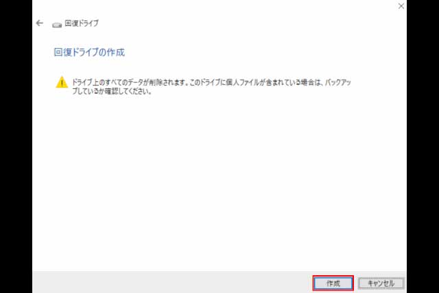 ちなみに、データがすでに入っているUSBメモリでも使用できますが、回復ドライブを作成すると内部データは全て消えてしまうため、 必要なデータが入ったUSBメモリは使用しないでください。