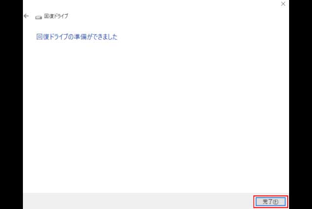 回復ドライブの作成が終わったら、「回復ドライブの準備ができました」と表示されます。